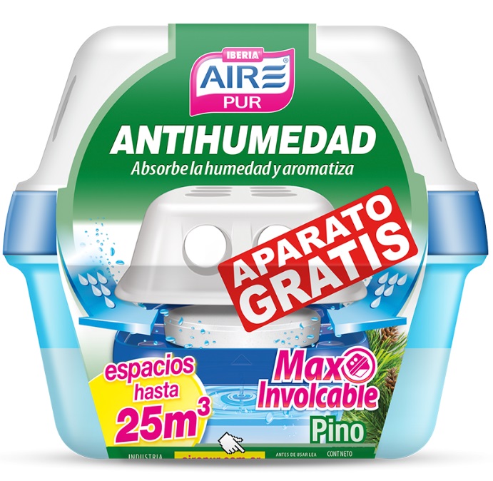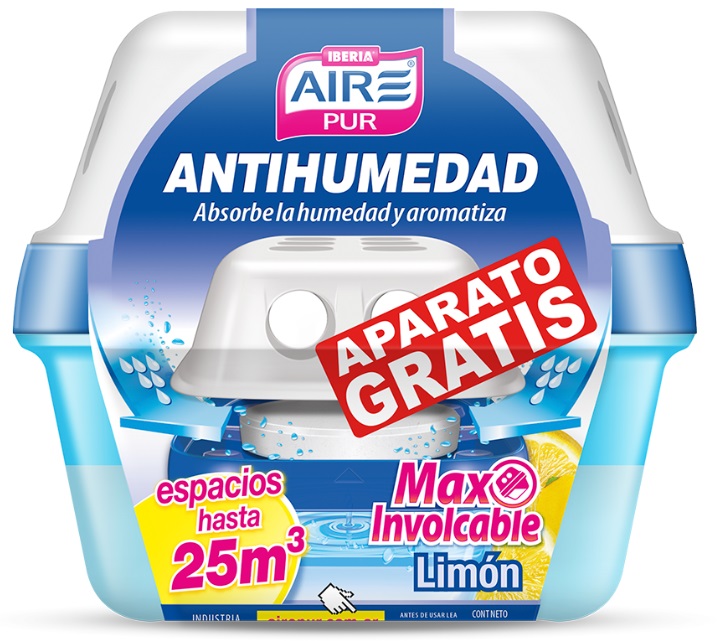 El nuevo Aire Pur® Antihumedad Max Involcable absorbe el exceso de humedad del ambiente y lo deposita en forma de líquido en su recipiente inferior. *Su novedosa tecnología con Repuesto Compact 250g permite una activación inmediata ayudando a disminuir problemas derivados de la humedad (malos olores, manchas de humedad, moho, etc) en cualquier espacio interior de hasta 25m3 (12m2): placares, baños, habitaciones, etc. Posee un exclusivo diseño involcable que evita derrames de líquido si el aparato se voltea accidentalmente. ADEMAS AROMATIZA LOS AMBIENTES. Duración 2-3 meses según condiciones climáticas y humedad relativa del ambiente. ATENCION: Siempre utilice el aparato con repuestos Aire Pur®.