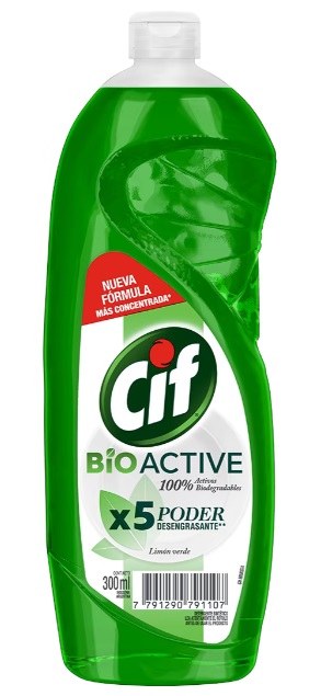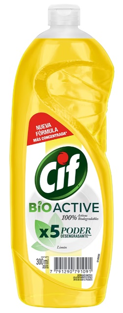CIF evolucionó y trae su mejor fórmula: ahora más concentrada garantizando un máximo rendimiento. Su nueva fórmula, se mantiene por más tiempo en tu esponja garantizando una espuma de larga duración, para que con menos cantidad de producto puedas lavar muchos más platos. Tiene un X5 Poder Desengrasante, que elimina la grasa difícil, incluso de los plásticos desde la primera pasada, dejando toda tu vajilla limpia y brillante. Además, tiene una nueva y única tecnología BIOACTIVE, que tiene 100% activos biodegradables. El nuevo CIF BIOACTIVE trae una nueva y mejor fragancia, que es también biodegradable y neutraliza los malos olores de toda tu vajilla. La botella del detergente concentrado Cif Frutas Cítricas, está hecha con plástico 100% reciclado y es también 100% reciclable, contribuyendo de este modo con el cuidado del medio ambiente. Para poder reciclar esta botella, seguí los siguientes pasos: 1. Lavá la botella de Cif Bioactive. 2. Desechala correctamente. 3. Botella 100% plástico reciclado. Para usar el producto aplicá directamente en la esponja, humedecé y apretá para generar espuma. Una vez que hayas terminado de lavar, enjuagá tu vajilla en agua caliente o fría. ¡Con CIF podés obtener un máximo rendimiento todos los días! Chau grasa, bienvenida belleza. Beneficios clave NUEVA FÓRMULA, MáS CONCENTRADA RINDE UN 30% MáS X5 PODER DESENGRASANTE TECNOLOGIA BIOACTIVE, CON 100% ACTIVOS BIODEGRADABLES NUEVAS FRAGANCIAS BIODEGRADABLES CON TECNOLOGIA NEUTRALIZADORA DE MALOS OLORES