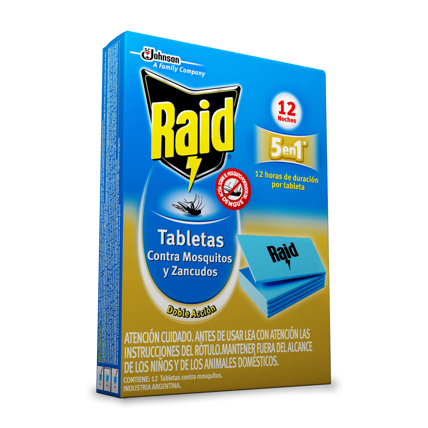 Raid® Tabletas repele los mosquitos por hasta 12 horas, actuando inclusive contra los mosquitos que pueden portar dengue. Disponible en paquete de 1 unidade. Cinco beneficios en uno: 1. Mata y repele 2. Protección toda la noche (hasta 10 horas de protección por noche) 3. Mata mosquitos ocultos 4. Ayuda a protegerte de mosquitos que podrían transmitir dengue 5. Fácil de usar